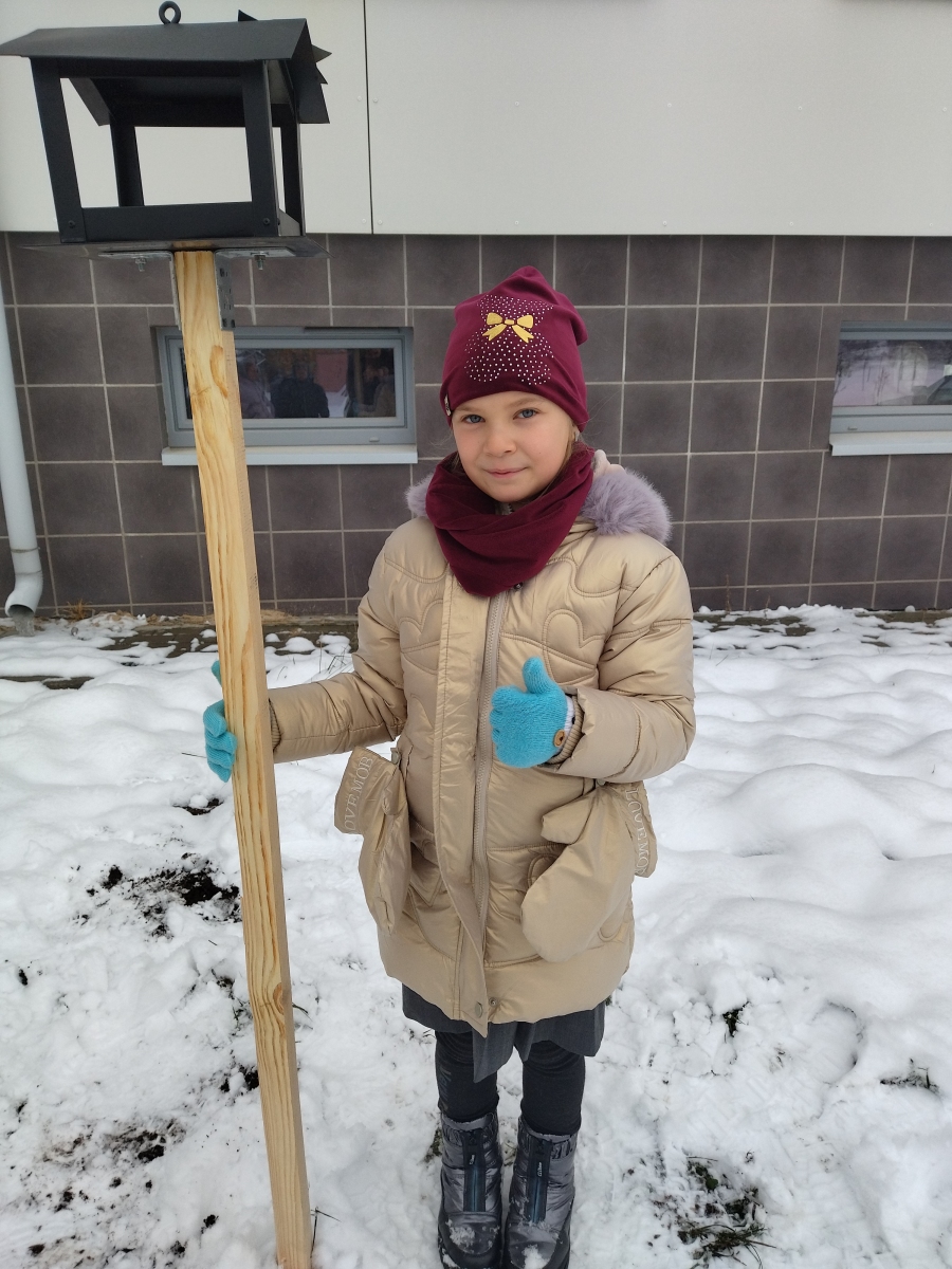 Dėkojame Patricijos tėveliui, Tomui Jarašiūnui, už pagamintas lesyklėles. Dabar galėsime rūpintis paukščiais ir per klasės langus stebėti juos.