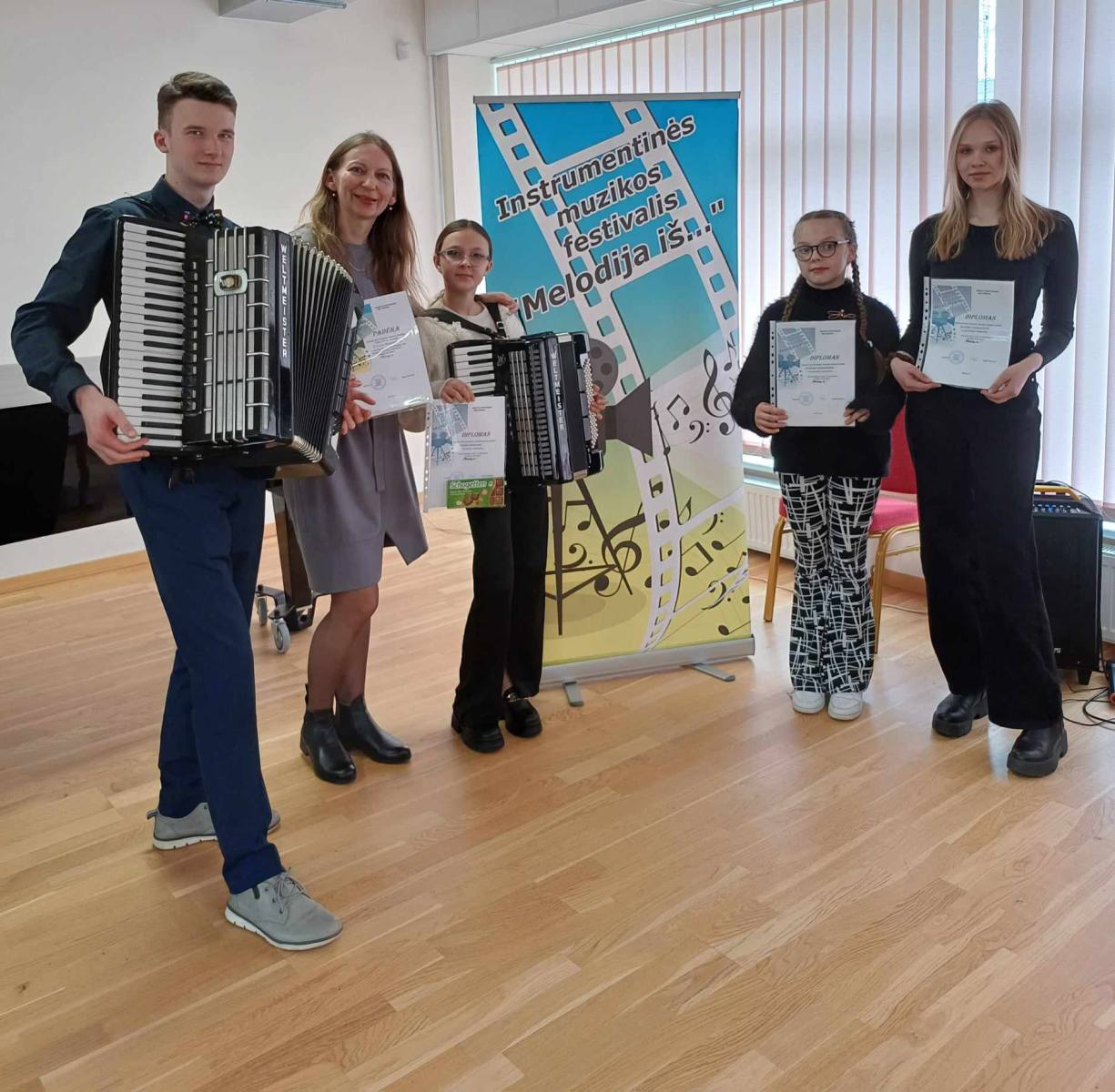 Balandžio 19d. Pakruojo Juozo Pakalnio menų mokykloje vyko instrumentinis (solo ir kamerinės) muzikos festivalis ,,MELODIJA IŠ…”. Skambias melodijas dovanojo Kuršėnų meno mokyklos, Gruzdžių vietovės akordeonistai: GUSTĖ MELENYTĖ, ANDRĖJA KARPINSKAITĖ, AUSTĖJA VAINAUSKYTĖ ir AISTIS ŽVIRBLIS. Apdovanoti diplomais ir saldžiomis dovanėlėmis užsukome į Pakruojo dvarą. Pakilios nuotaikos ir pilni įspūdžių grįžome namo.